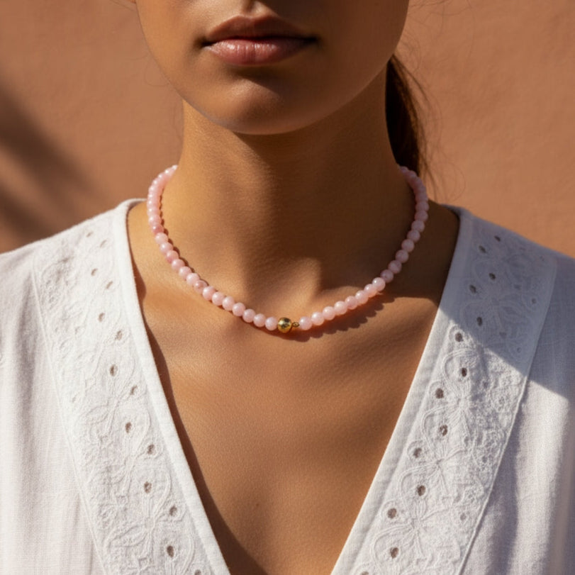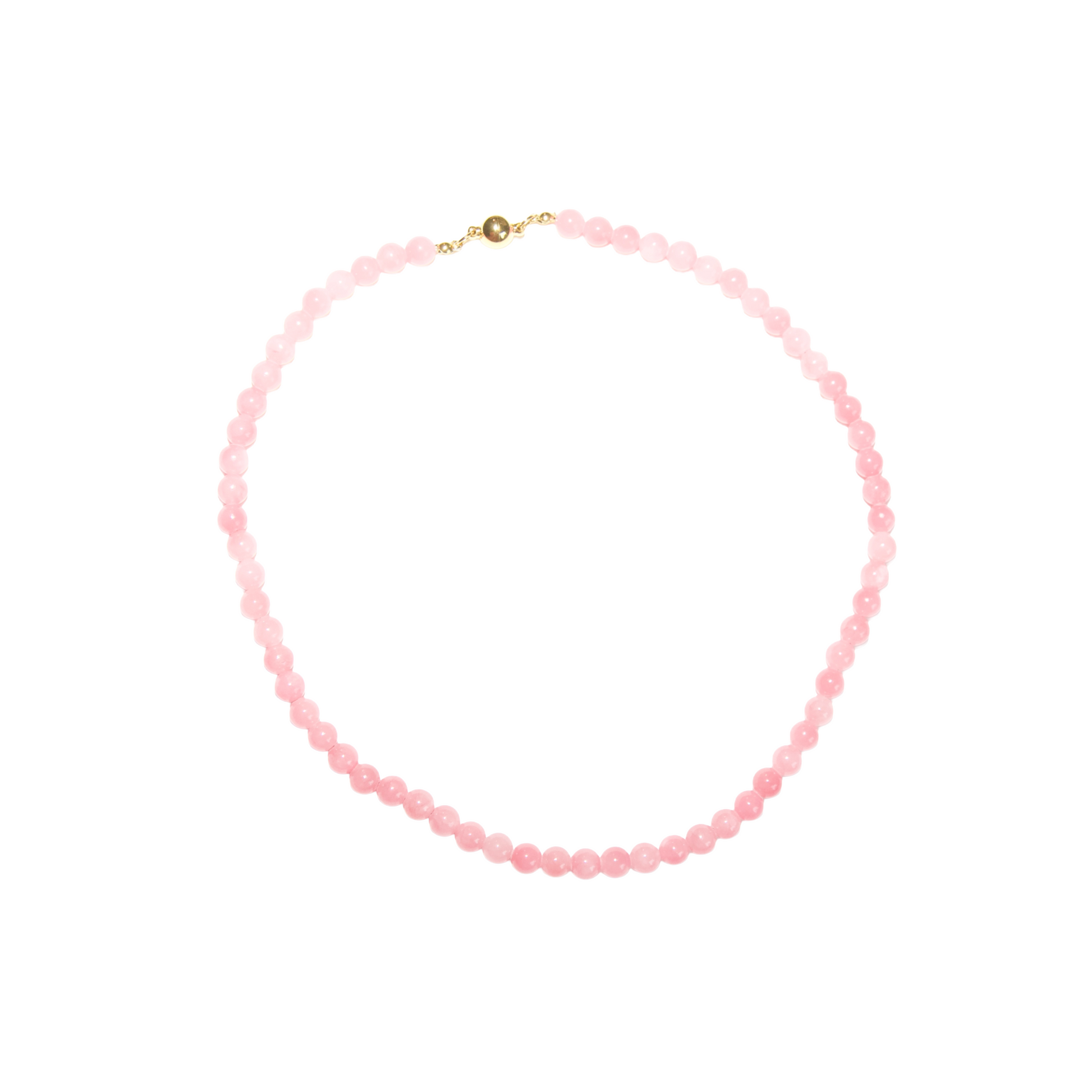 Unsere Elsa strahlt in zarten Rosé-Tönen und verleiht jedem Outfit eine feminine Leichtigkeit. Die gleichmäßig geschliffenen Perlen schimmern dezent und wirken zugleich verspielt wie elegant.