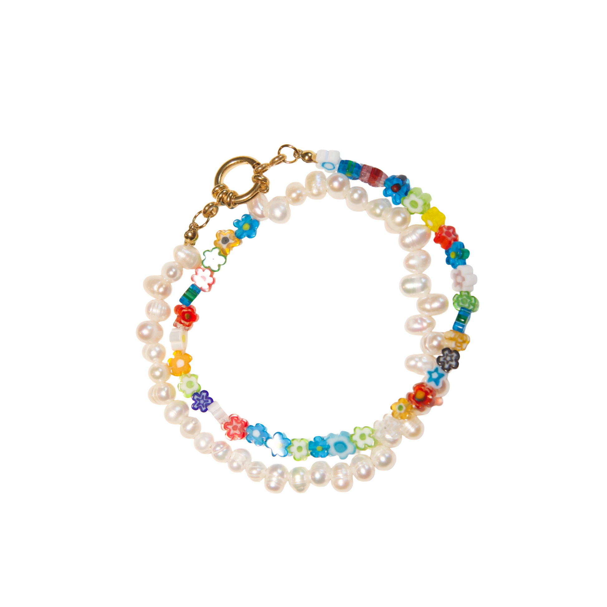 Unsere Greta ist das verspielte Pendant zu unserer Ivy Kette. Die Kombination aus zarten Süßwasserperlen und farbenfrohen Blumen-Elementen macht sie zu einem fröhlichen Eyecatcher, der jedem Look sofort Sommerfeeling verleiht.
