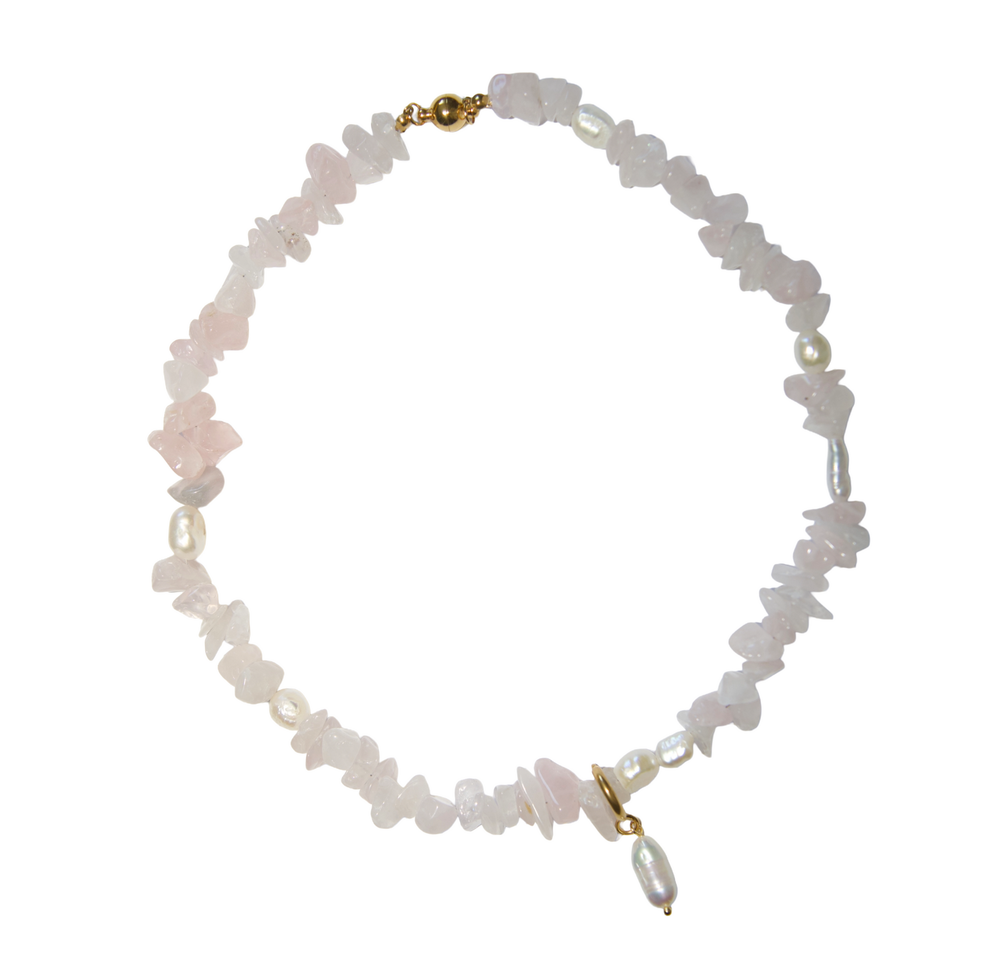 Unsere Ina Kette vereint die sanfte Schönheit von Rosenquarz und Süßwasserperlen zu einem eleganten, femininen Design. Der Rosenquarz steht für Liebe und innere Ruhe und macht die Kette zu einem besonderen Begleiter für jeden Tag.