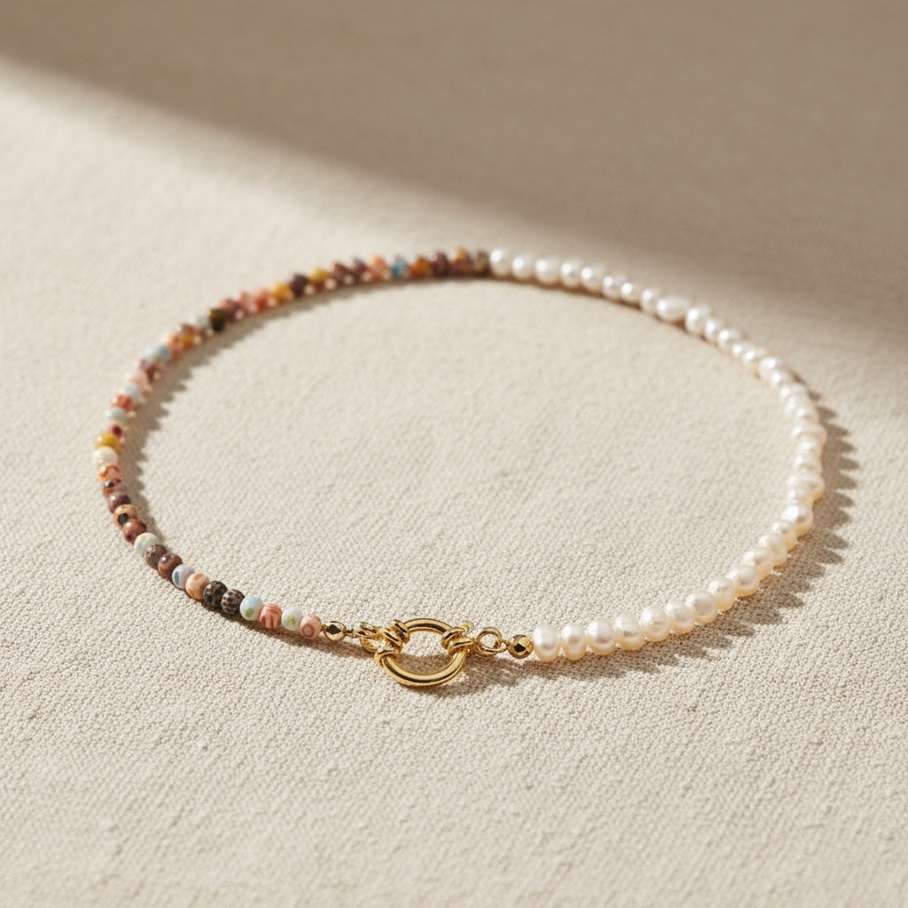 Die Kette kombiniert zarte, schimmernde Süßwasserperlen mit kunstvollen und farbigen Glasperlen. Die harmonische Anordnung der Materialien schafft ein ausgewogenes Design – auf der einen Seite klassische Perlen, auf der anderen lebendige Farbvielfalt. Diese einzigartige Kombination verleiht jedem Outfit einen besonderen Akzent und macht die Kette zu einem vielseitigen Begleiter.