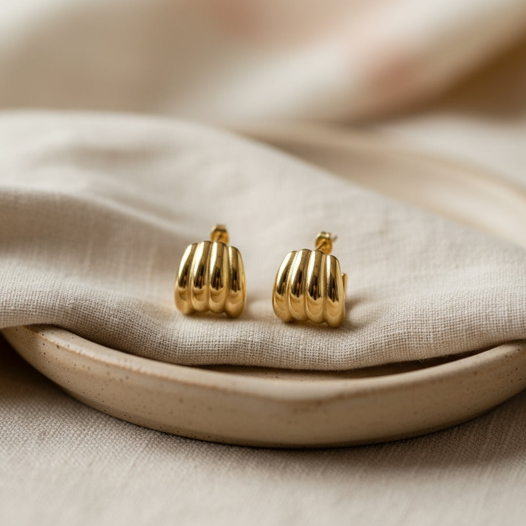 Diese goldfarbenen Ohrstecker begeistern durch ihre markante, gerillte Struktur, die dem klassischen Design eine moderne und kraftvolle Note verleiht. Die sanften Rundungen fangen das Licht auf elegante Weise ein und sorgen so für einen besonderen Glanz.