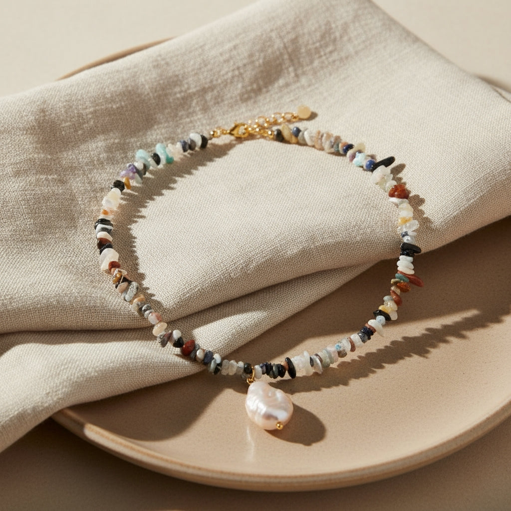 Die Kette besteht aus einer harmonischen Mischung natürlicher Edelsteinperlen, die mit ihren verschiedenen Farben und Formen ein lebendiges Gesamtbild schaffen. Der tropfenförmige Perlenanhänger in einer goldfarbenen Fassung setzt einen eleganten Akzent und rundet das Design stilvoll ab.
