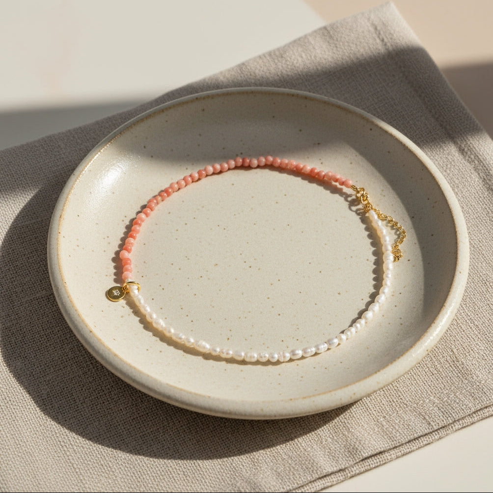 Diese handgefertigte Halskette vereint die sanfte Eleganz von Süßwasserperlen mit der warmen Farbigkeit rosafarbener Edelsteinperlen. Der fließende Übergang der beiden Materialien verleiht ihr eine besondere Leichtigkeit und macht sie zu einem vielseitigen Begleiter für Alltag und besondere Anlässe.
