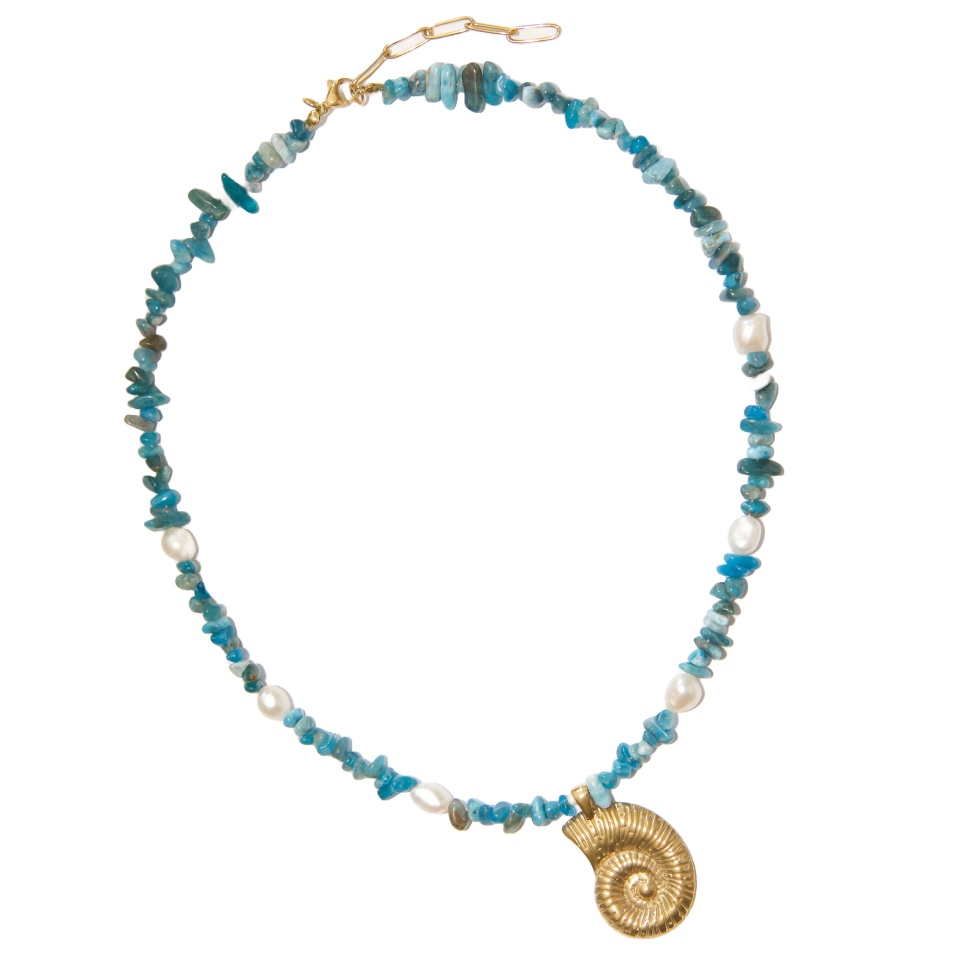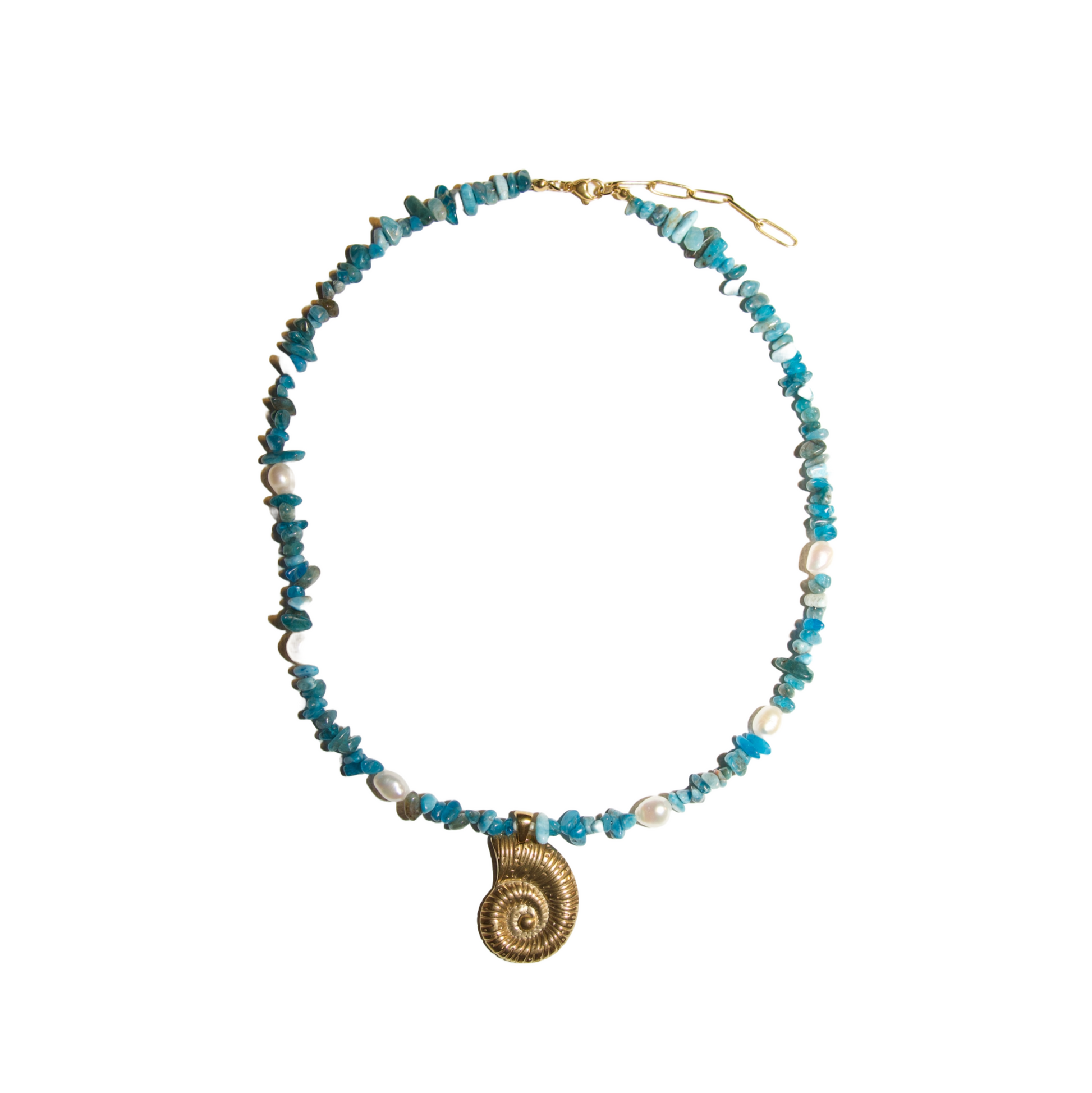 Unsere Mara Kette vereint die natürliche Leuchtkraft türkisfarbener Edelsteinchips mit der schimmernden Eleganz von Süßwasserperlen. Der goldfarbene Muschel-Anhänger bildet den Mittelpunkt des Designs und erinnert an die Weite des Meeres und die Schönheit der Natur.