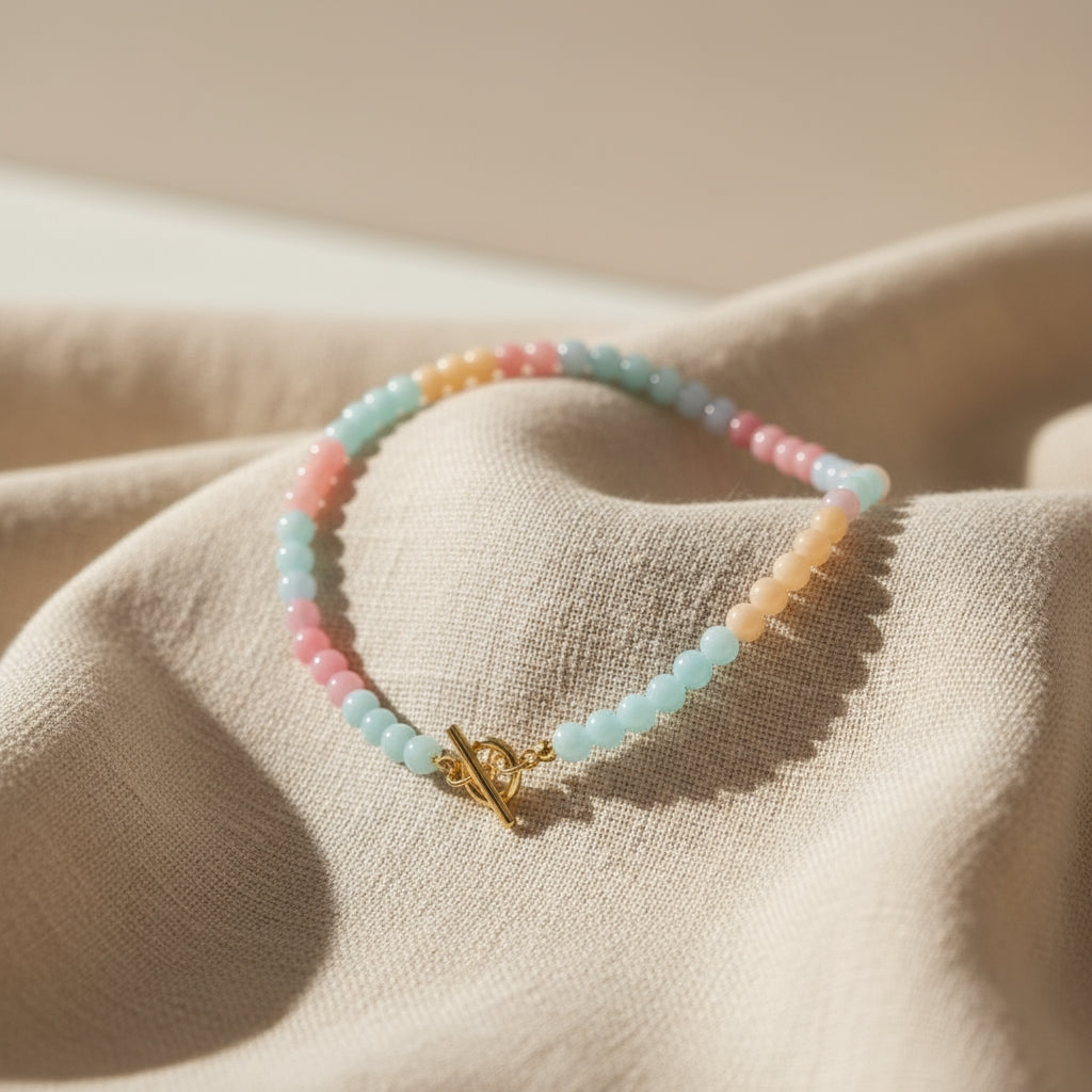 Ob Du ein einzigartiges Accessoire für den Alltag suchst oder Deinem Look eine verspielte Leichtigkeit verleihen möchtest – die handgefertigte Pastell-Edelsteinkette ist das perfekte Schmuckstück. Sie kombiniert sanfte Farben mit einem schlichten, harmonischen Design und sorgt für eine elegante, frische Ausstrahlung.