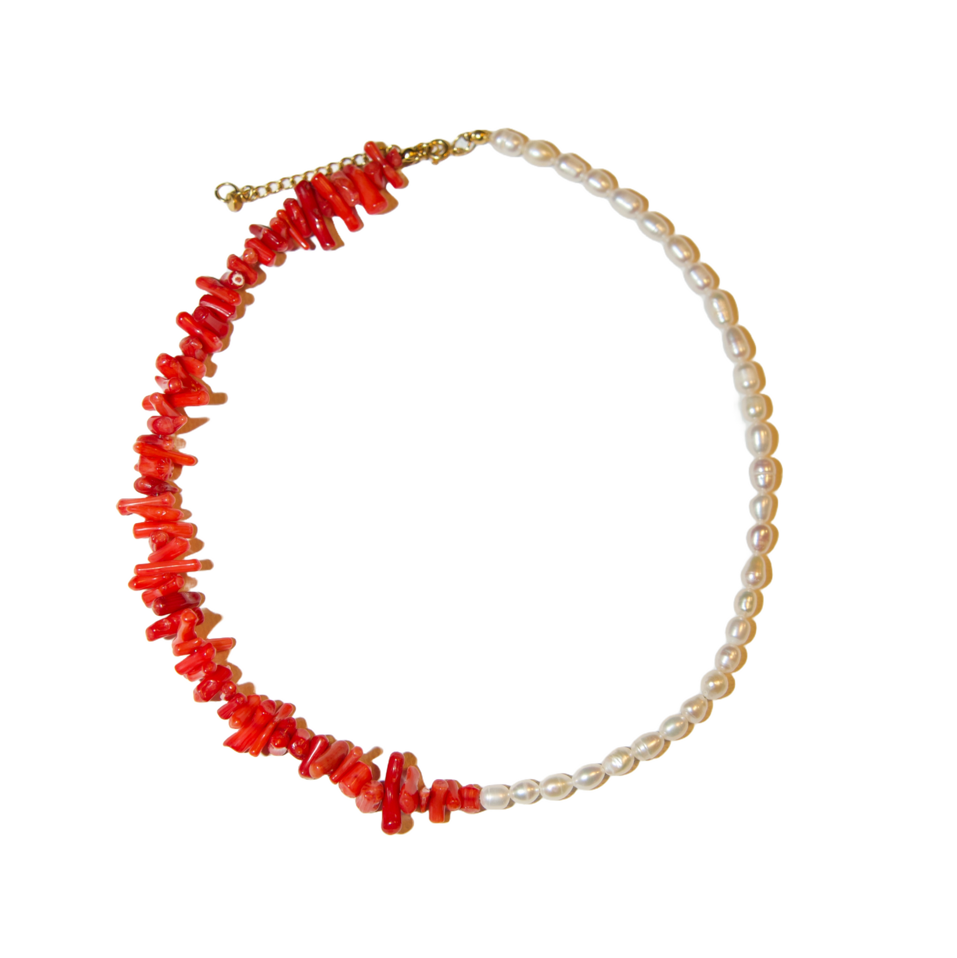 Die Ronja Kette vereint die schimmernde Eleganz von Süßwasserperlen mit der intensiven Leuchtkraft roter Korallen. Das spannende Spiel zwischen zarter Zurückhaltung und kräftiger Farbigkeit macht sie zu einem besonderen Schmuckstück, das sofort ins Auge fällt.