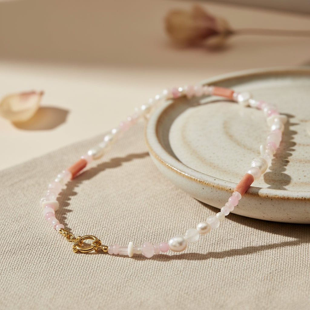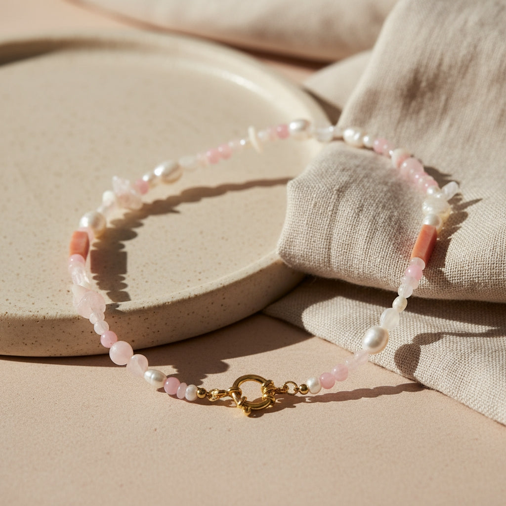 Die Kette besteht aus einer harmonischen Mischung aus Süßwasserperlen, Rosenquarz und Korallen-Elementen. Die sanften Rosé- und Cremetöne verleihen ihr eine edle und zugleich verspielte Leichtigkeit. Durch die verschiedenen Perlenformen entsteht eine natürliche, organische Optik, die jedes Schmuckstück einzigartig macht.